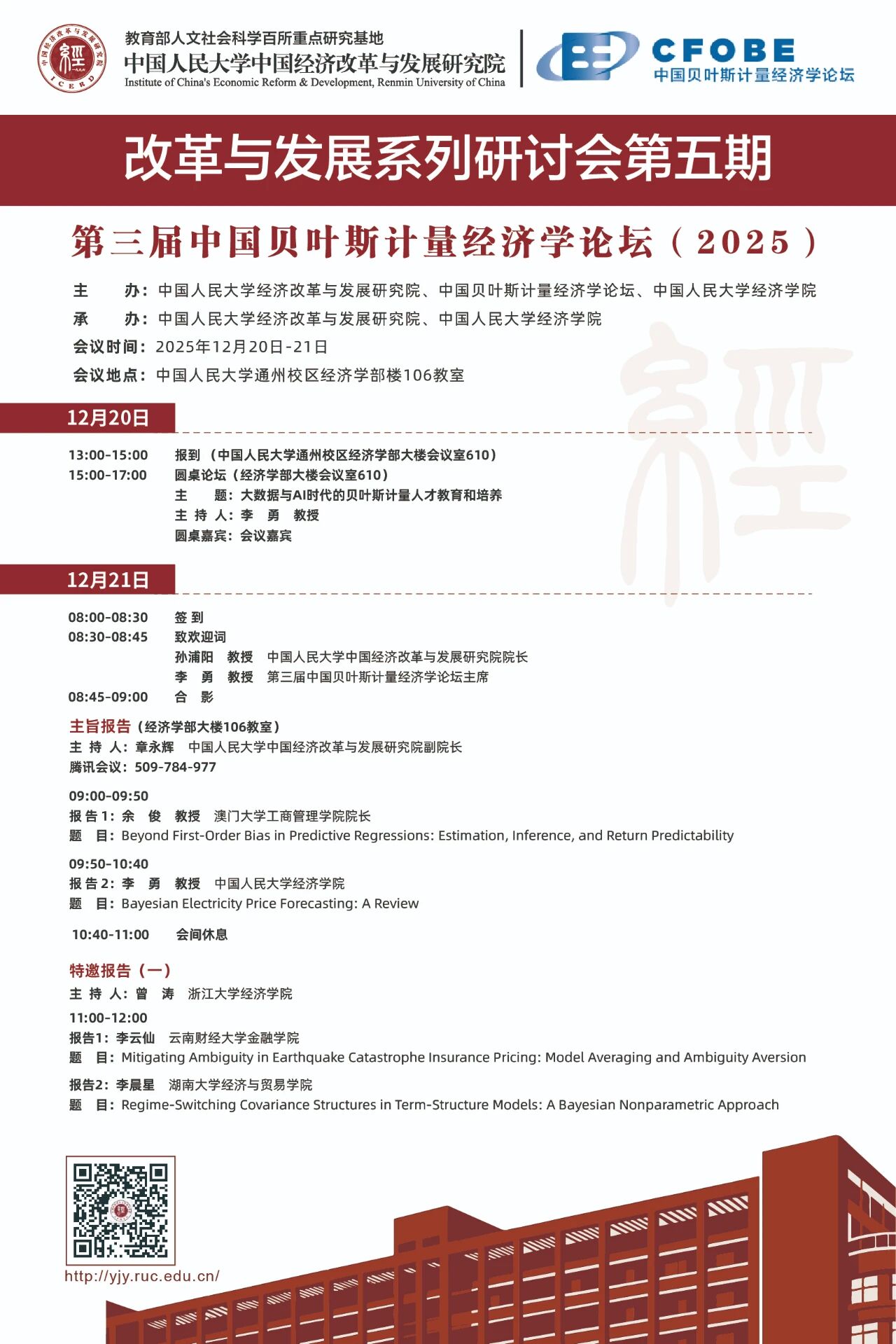 2025年12月20日至21日,由中国人民大学中国经济改革与发展研究院、中国贝叶斯计量经济学论坛、中国人民大学经济学院主办的改革与发展系列研讨会第五期暨第三届中国贝叶斯计量经济学论坛(2025),将在中国人民大学通州校区经济学部楼106教室举行。