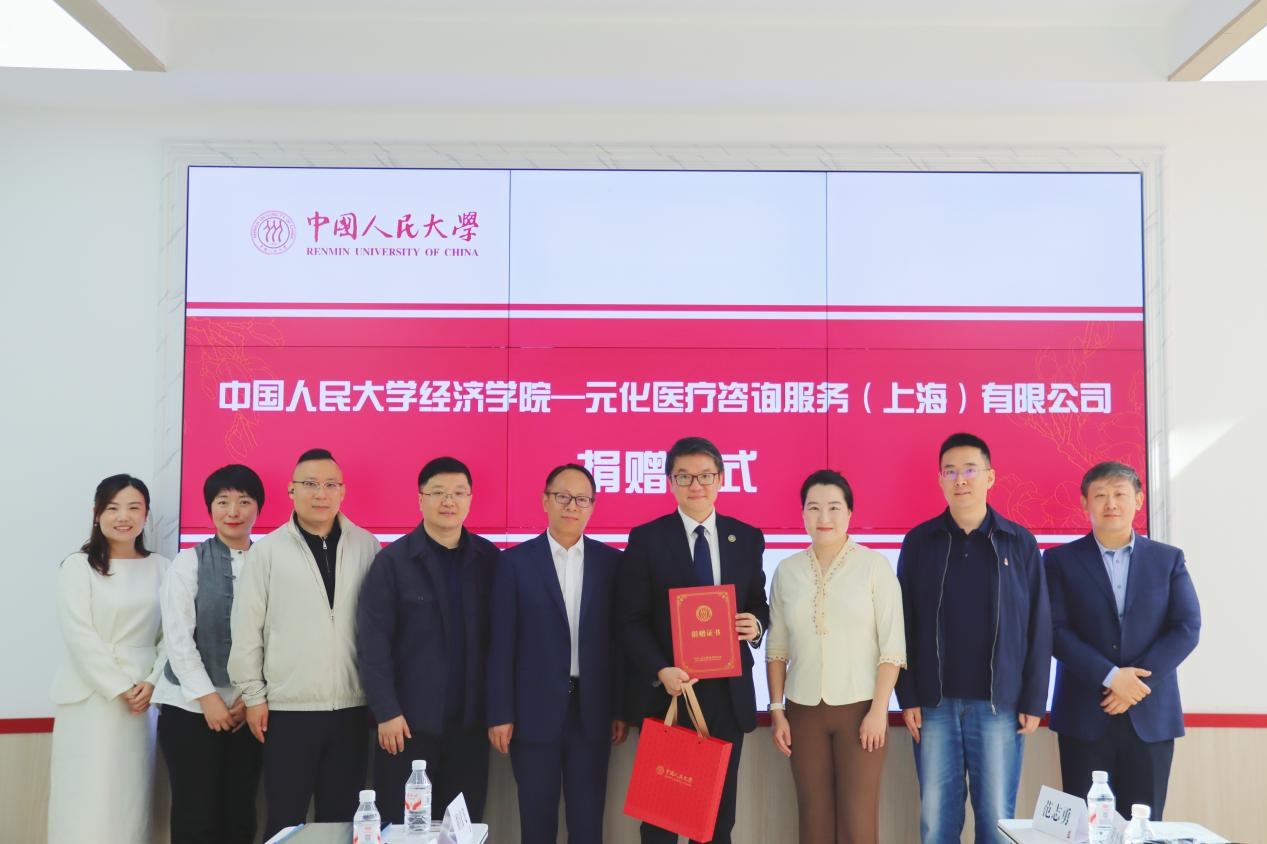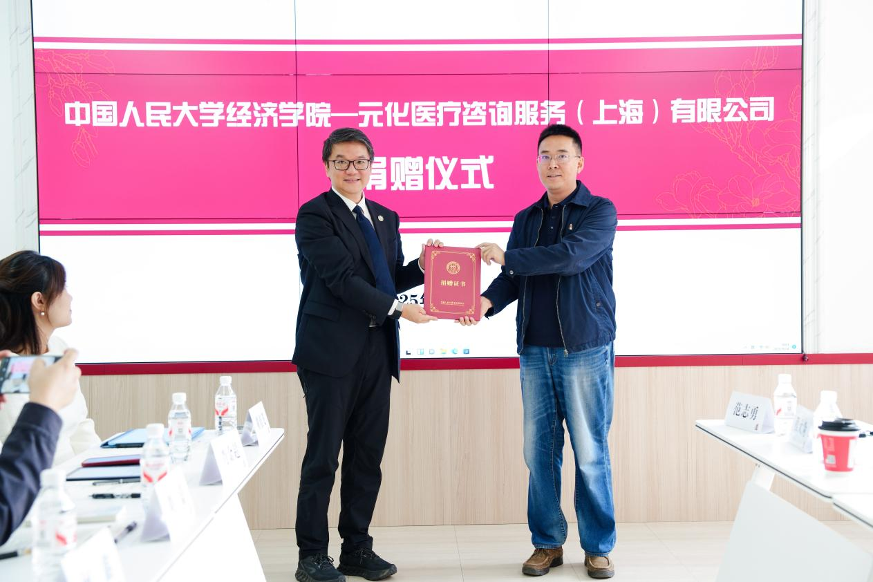 2025年10月14日上午,中国人民大学经济学院与元化医疗咨询服务(上海)有限公司捐赠签约仪式在我校举行。本次仪式由经济学院党委书记阎芳主持,双方代表共同见证元化医疗向中国人民大学经济学院捐赠资金,用于“企业出海需求及政策研究项目”,携手服务国家高水平开放战略。
