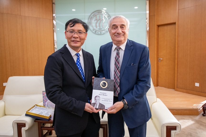 讲座开始前,经济学院副院长李三希教授与莫基尔教授亲切交流,并代表学院向莫基尔教授颁发讲座纪念牌。