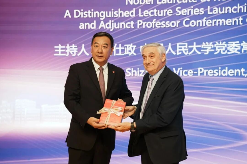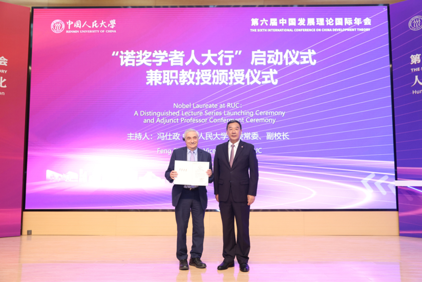 10月25日,近400位中外知名学者和学生齐聚中国人民大学,以“人文经济与中国式现代化”为主题,隆重举行第六届“中国发展理论”国际年会,共谋“十五五”时期中国和全球经济发展中的重大议题,会上学校举办“诺奖学者人大行”启动仪式,中国人民大学党委书记张东刚为乔尔·莫基尔颁发兼职教授聘书,并赠送中国人民大学“文明新形态‘两史两论’丛书”。中国人民大学副校长冯仕政主持。