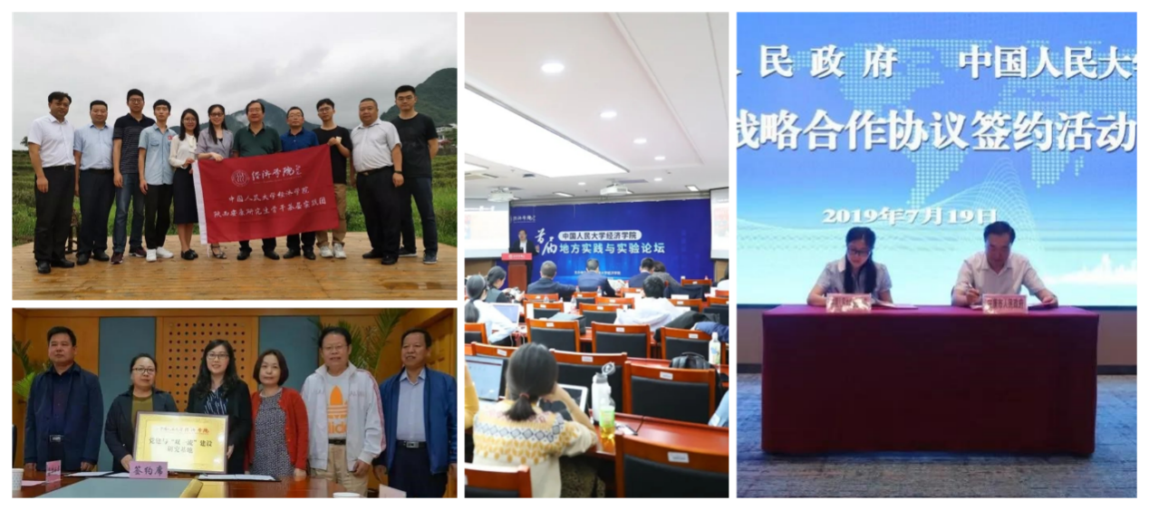 经济学院已与陕西省安康市、贵州省湄潭县、四川省泸县、安徽省小岗村等十个地方政府与企业合作共建经济学院党建与“双一流”建设研究基地,目前已成为中国人民大学规模最大、数量最多的双一流实践基地。