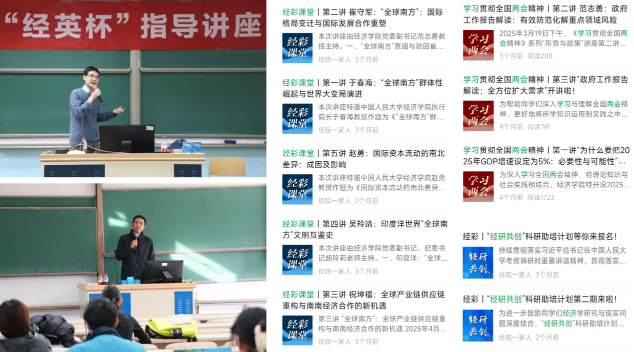 打造专业教育与思政育人相融合的“经彩课堂”品牌讲座,邀请知名学者围绕时政热点、经济前沿、人文经济等主题开展系列讲座,深化学生对经济学理论实践应用的理解;构建“经研共创”师生协同创新平台,通过学术专家和业界导师命题,引导师生共同探索现实经济问题;加强学科竞赛培育体系建设,围绕“经英杯”“求是学术”等品牌赛事开展专题辅导,组织获奖师生分享参赛经验,全面提升学生科研创新能力。